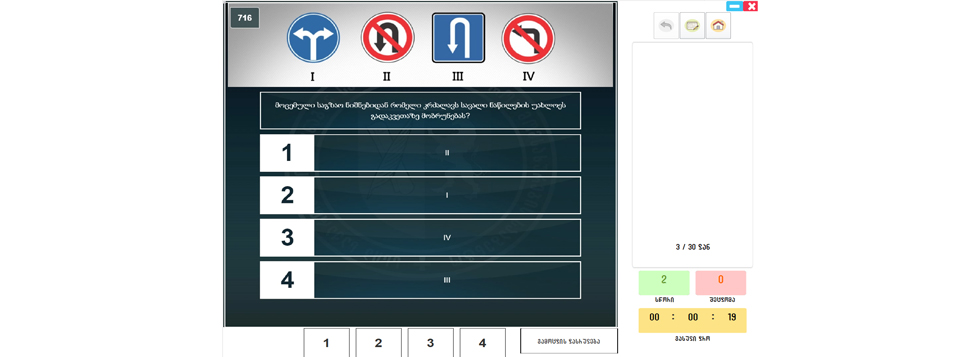 თუ თქვენ გექნებათ სურვილი შეამოწმოთ თქვენი ცოდნა გამოცდის კატეგორიაში ესეც შეგიძლიათ, მთავარი მენიუდან გადახვალთ "გამოცდა" ის გვერდზე, აირჩევთ თქვენთვის სასურველ თემებს ან ყველა თემას და დაიწყებთ გამოცდას, გამოცდის დასრულების შემდეგ პროგრამა გაძლევთ საშუალებას გადახედოთ თქვენს შედეგებს რომელ ბილეთში დაუშვით შეცდომა ან პირიქით რომელს გაეცით სწორი პასუხი. თუ გამოცდაში გექნებათ დაშვებული შეცდომები არ იდარდოთ პროგრამა ყველა დაშვებულ შეცდომას აგიხსნით ზედმიწევნით.